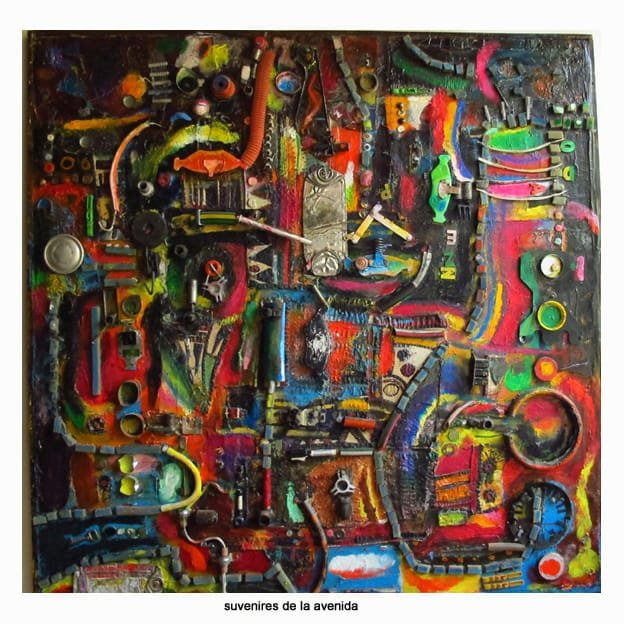 Ella nos contó que el cuadro “data del año 2014 durante una visita a la casa de Castelar, la casa de infancia. Mi mamá ya había fallecido y fui caminando por la Avenida Ceballos hasta el cementerio para visitar su tumba. En ese trayecto el paisaje consiste en talleres de autos, parrillas, el Matadero, y también negocios que venden ruedas de autos y repuestos. También hay jaurías de perros abandonados que viven en el cementerio y salen a buscar comida. En mi camino de regreso, bajo el cielo rojo del atardecer castelarense, descubrí la cantidad de objetos descartados que se acumulan aquí y allí. Y los fui recogiendo. Al día siguiente empecé a trabajar en esta pintura”