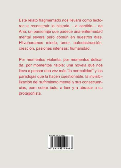 “Este relato fragmentado nos llevará como lectores a reconstruir la historia — a sentirla– de Ana, un personaje que padece una enfermedad mental severa pero común en estos tiempos. Hilvanaremos miedo, amor, autodestrucción, creación, pasiones: humanidad”